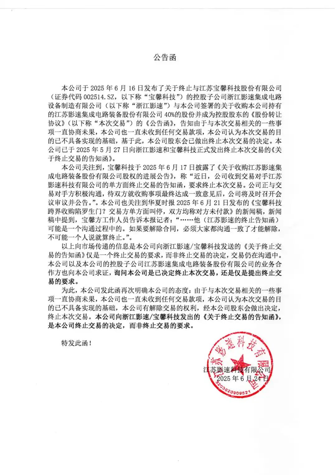 控股股東影速科技已終止與寶馨科技(證券代碼002514.SZ)的控股子公司浙江影速關(guān)于收購本公司40%股份的交易
